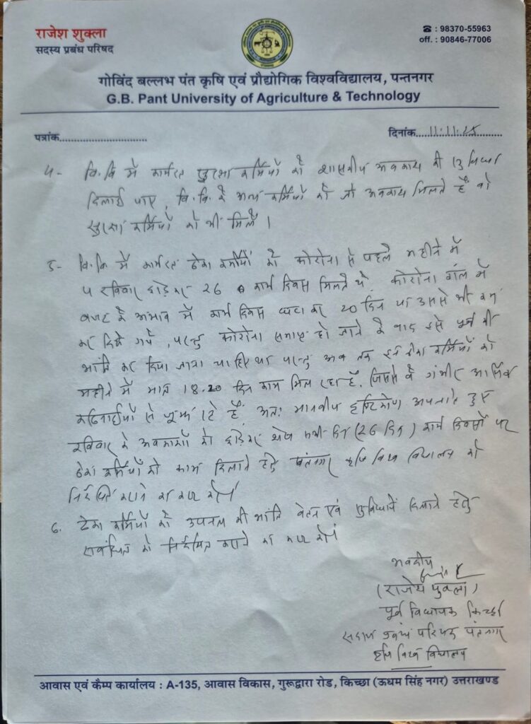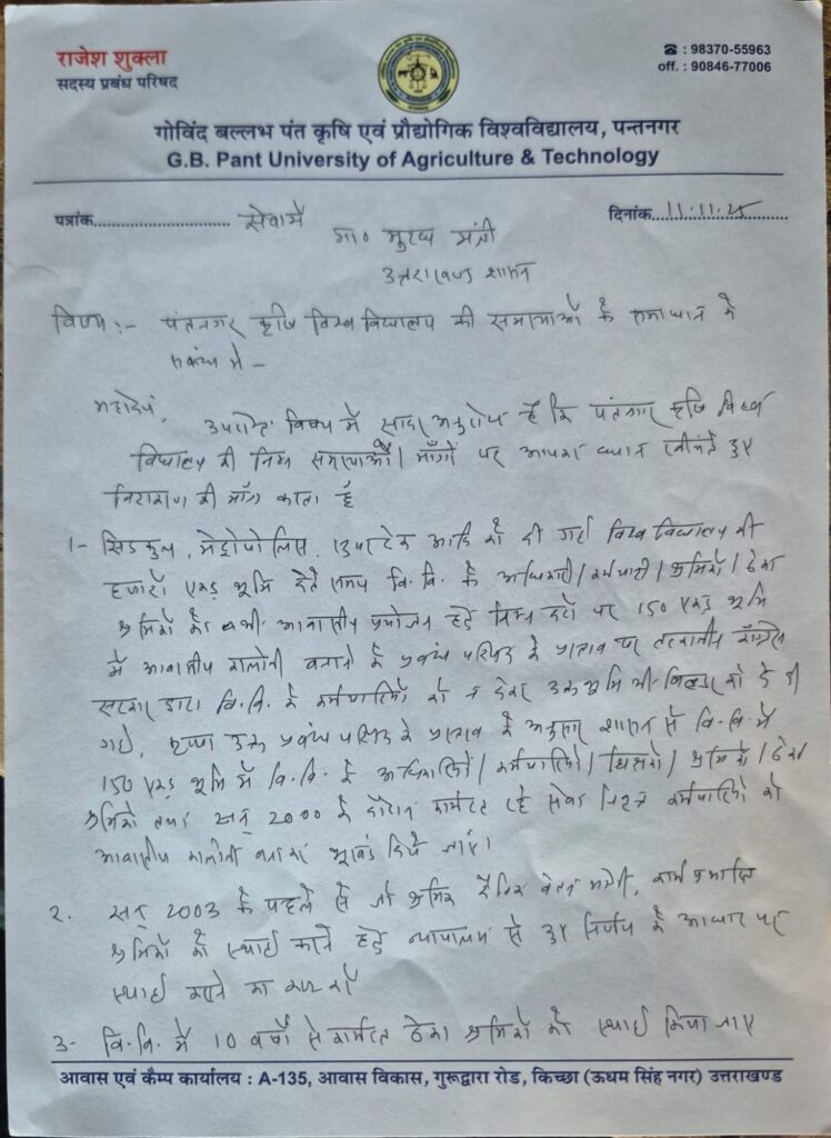 राजेश शुक्ला ने बताया कि वर्ष 2002 में औद्योगिक पैकेज मिलने के बाद जब सिडकुल के लिए विश्वविद्यालय की भूमि अधिग्रहित की जा रही थी, उस समय कर्मचारियों एवं श्रमिकों ने अपने लिए भूमि की मांग की थी। प्रबंधन परिषद ने उस प्रस्ताव को पारित किया था, लेकिन तत्कालीन कांग्रेस सरकार ने वह भूमि एक बिल्डर को आवंटित कर दी। परिणामस्वरूप विश्वविद्यालय के अधिकारी, कर्मचारी एवं श्रमिक इस योजना से वंचित रह गए।